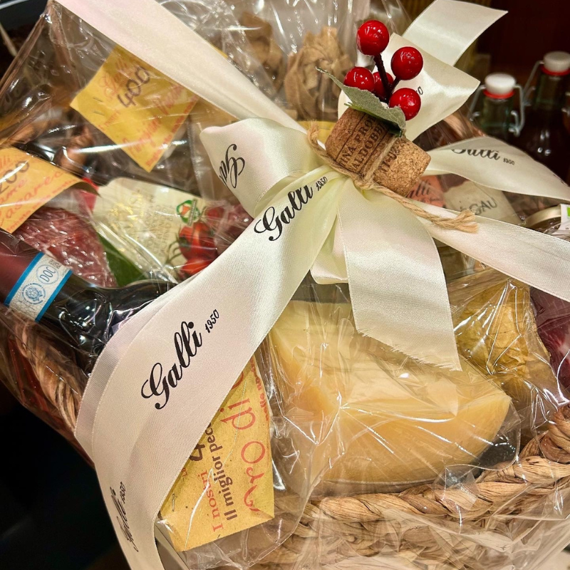 Mezzo capocollo casareccio Galli, salsicce nostrane umbre, mezzo salame casareccio di Visso, pecorino al tartufo nero di Norcia, ciriole artigianali ternane, pecorino mezzano "Oro di Galli" e vino rosso di Montefalco 75cl